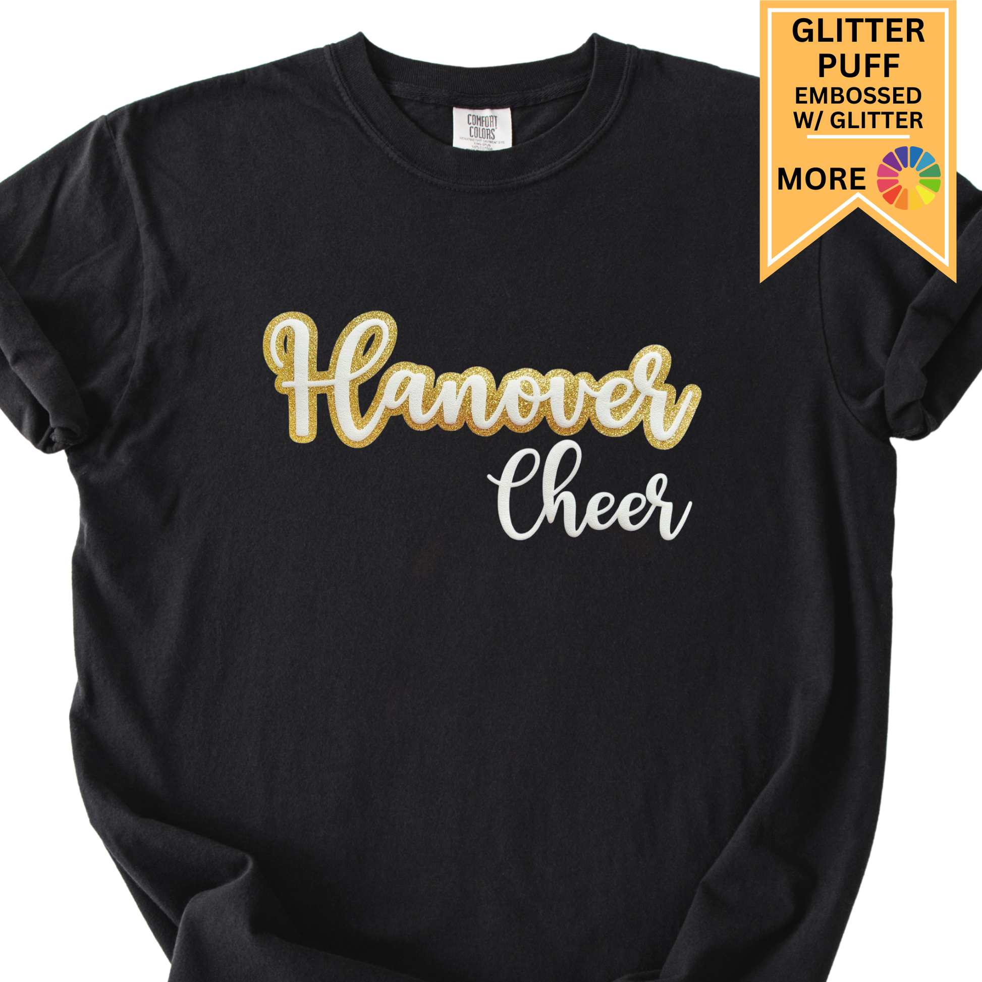 Rep your school, team, or organization with a Custom Comfort Colors Tee that’s as cozy as it is eye-catching. Each shirt is personalized with your team name or logo in a two-color design, combining your choice of vinyl/glitter and puff or vinyl/glitter and glitter puff for the perfect mix of sparkle and dimension.